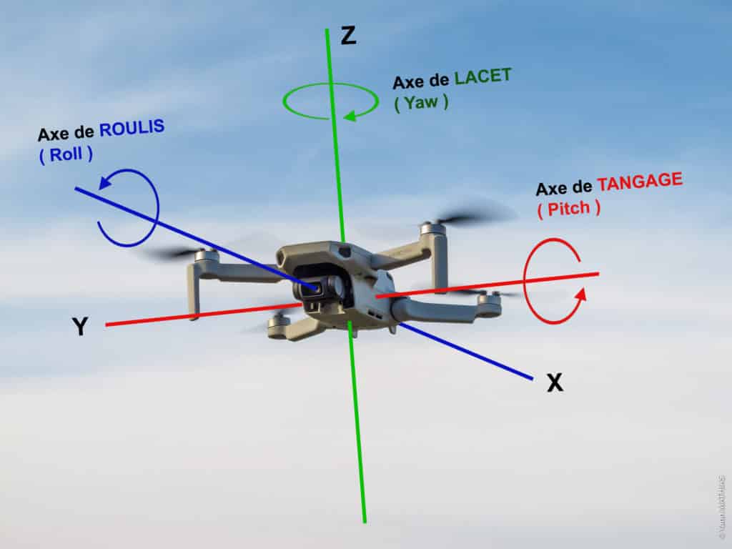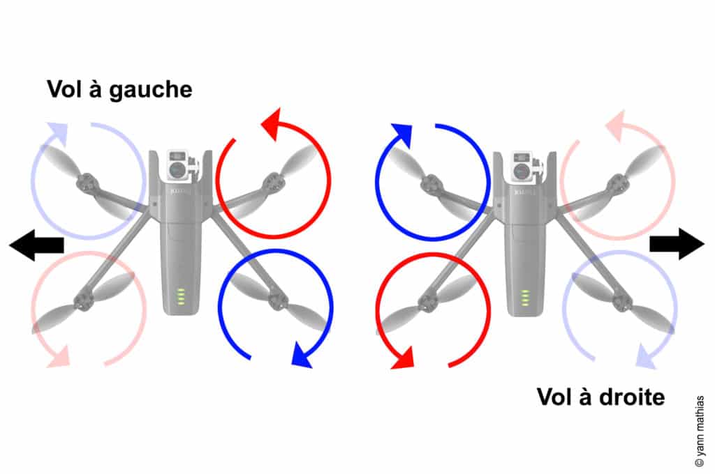 Pour basculer d’un côté à l’autre, c’est l’axe de roulis qui intervient. Toujours avec la manette droite, cette fois vers la gauche ou la droite, on agit sur la puissance des moteurs situés de chaque côté du drone : ceux du côté où l’on souhaite aller ralentissent, ceux de l’autre accélèrent, créant une inclinaison latérale et un déplacement fluide.