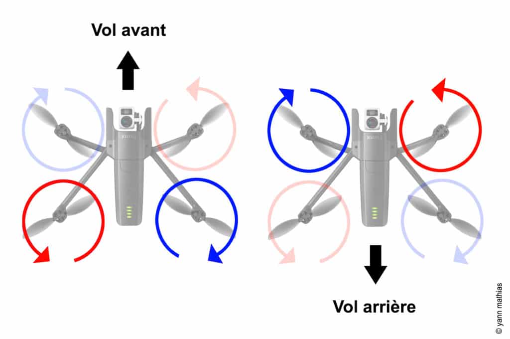 Pour déplacer l’appareil vers l’avant ou l’arrière, c’est l’axe de tangage qui entre en jeu, commandé par la manette droite. Lorsque vous poussez le stick en avant, les moteurs avant voient leur puissance réduite, tandis que ceux de l’arrière accélèrent : le drone s’incline et avance. Pour reculer, c’est simplement l’inverse : puissance accrue à l’avant, diminuée à l’arrière.