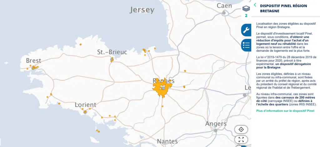 Le décret du préfet de la région prévoit les zones éligibles du régime. 14 grandes villes pourront en profiter : Rennes, Saint-Malo, Brest, Quimper, Lannion, Saint-Brieuc, Lorient, Auray, Vannes, Bain-de-Bretagne, Melesse, Liffré, Vitré et Fougères. Au total, 58 municipalités bretonnes sont touchées par le « Pinel » Breton ».