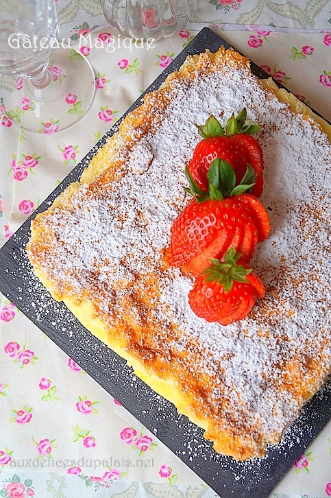 Gâteau magique facile, une recette ultra simple et rapide pour un délicieux dessert incroyablement fabuleux, gâteau magique à la vanille le terme est parfaitement utilisé, c’est un gâteau ancien du Sud-Ouest de la France et en particulier des Charentes, le Millasson (traditionnellement préparé avec de la farine de maïs), un dessert 3 en 1 avec des couches superbement gourmandes. Un flan succulent et parfumé, une crème crémeuse avec la texture fondante de la crème pâtissière et enfin une éponge aérée, moelleuse et mousseuse de quelque chose pour vous plaire sans sortir tous ses pots et bols, il suffit de mélanger harmonieusement le sucre, la vanille, les jaunes d’œufs, le beurre fondu, le lait et la farine puis d’incorporer les blancs Of neige monté doucement alors vous avez juste à mettre cette préparation pour cuire et réfrigérer pour la prochaine profiter en un rien de temps. Pour les plus gourmets, ajoutez un nuage de sucre glace et quelques fraises c’est le mariage parfait qui séduira les papilles ! Ce gâteau magique fait le Buzz sur la blogosphère tout le monde l’a testé je pense que je suis le dernier mais mieux tard que jamais il est ! Ce gâteau magique est déclinable à l’infini, il peut être parfumé avec du citron, du café, du chocolat, du spéculoos, du caramel, de la noix de coco, de la fleur d’oranger et même ajouter des framboises fruitées, des cerises, des bleuets, des pommes, des mûres, etc.